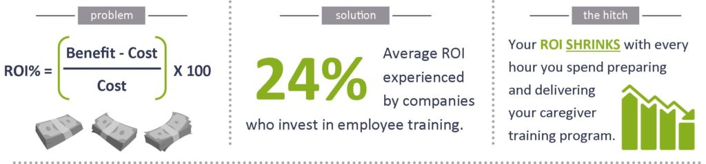The value of professional training and its return on investment (ROI) shouldn’t be difficult to measure. Start by figuring out how much you spend on your caregiver training now. Then look at all the results (or benefits) of that training, such as caregiver retention rates, referrals, reviews and readmission rates.